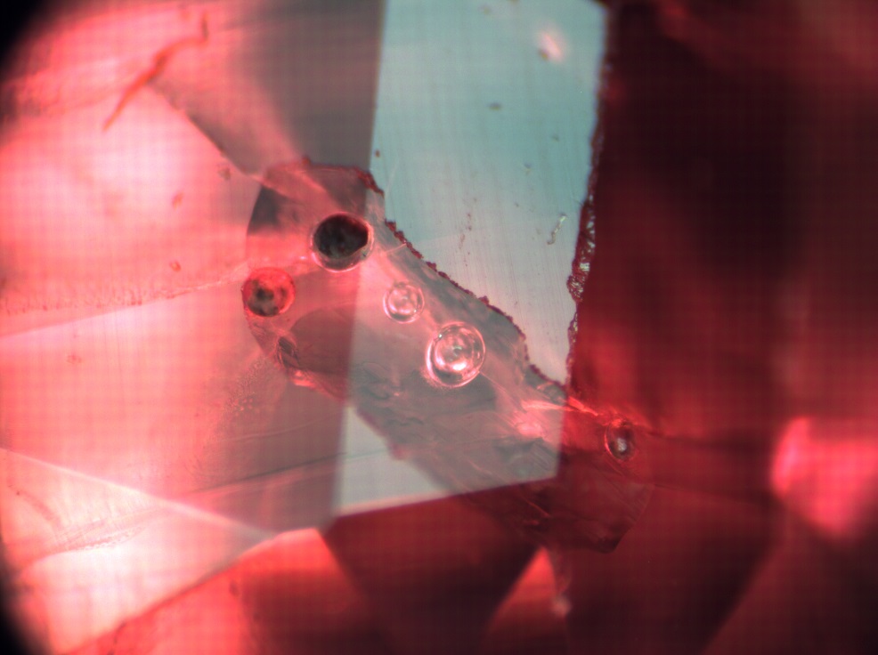 Natürlicher Rubin mit einem teilweise gefüllten Hohlraum, wahrscheinlich Flussmittel, das Blasen enthält
