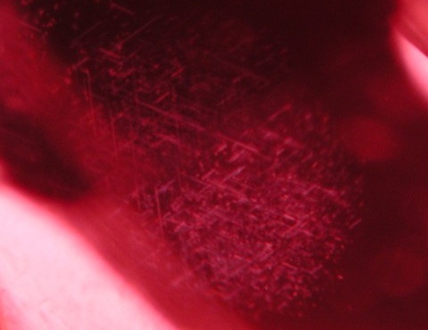 Nadelförmige Kristalle und kleine Partikeleinschlüsse in nicht erhitztem Mogok-Rubin